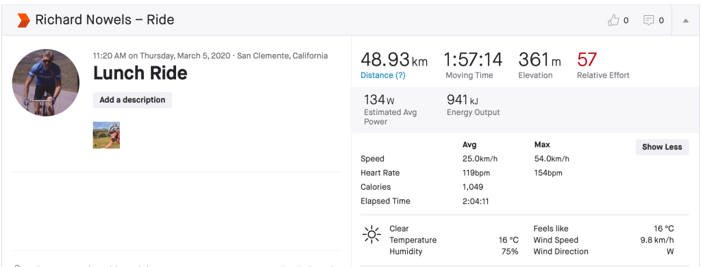 I figure the first several rides are going to be constrained by my water carrying capacity of me and my bicycle. I am hoping I can do one of my old usual loops out to Ortega Park and back. Reviewing the metrics from the last time I rode that route almost exactly a year ago, I can see it is about a two hour ride, but a massive for my indoor distances of nearly fifty kilometers. It is relatively flat with only three hundred and sixty-one meters of climbing. I would normally ride out to the park, stop and get water and a restroom break then ride back home, looping around the harbor at Dana Point.