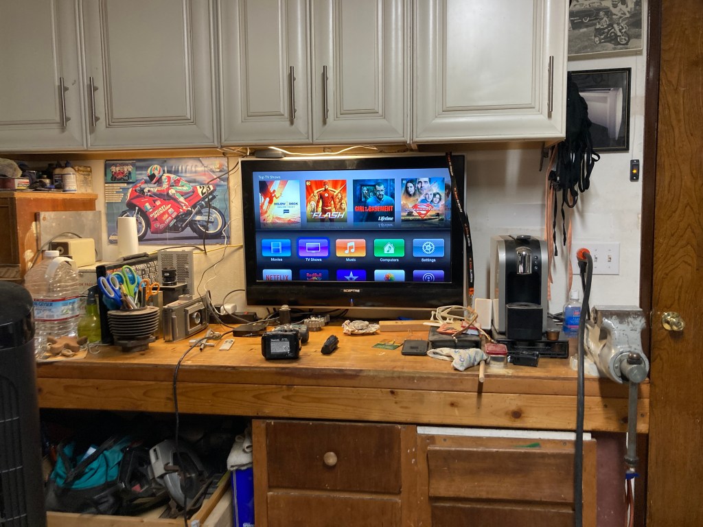 First up on the prep, is moving the monitor to the wall under the cabinets. We live in a small house with little storage, there just isn’t anywhere to pack a flat screen away for safe keeping and readily at hand for bad weather indoor training. So, to the wall it is. A twelve dollar mount sourced online makes it simple enough.