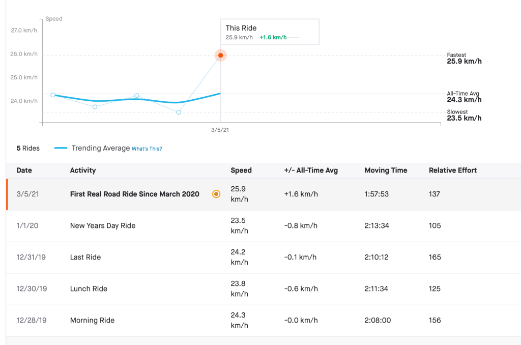 I’ve ridden the exact same route only five times including today. I felt slow, but not weak, just taking it easy to enjoy the first ride and not hurt myself.